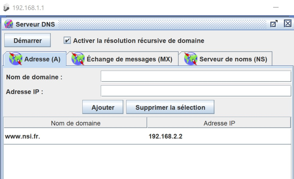 - En mode simulation (flèche verte), ajouter un serveur DNS à ce nouvel ordinateur. Configurer ce serveur DNS en ajoutant, dans l’onglet Adresse(A), le nom de domaine www.nsi.fr à l’adresse IP 192.168.2.2 (l’autre ordinateur « tour » tout à droite).